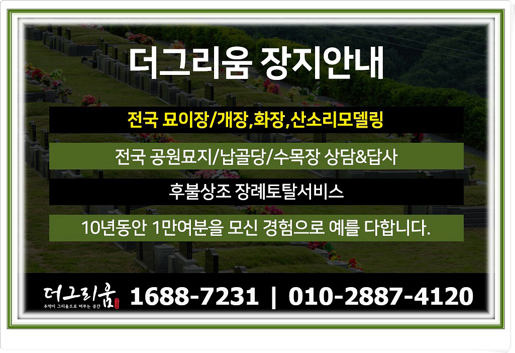 신규 장지를 둘러보실 때 모셔지고 방문하시는 분들이 많다면 그만한 이유를 고루 갖춘 곳으로 오랜동안 믿을 수 있는 반증이 되어 결정하실 때는 형제 두분이상이 보시는 것을 권해드립니다.
